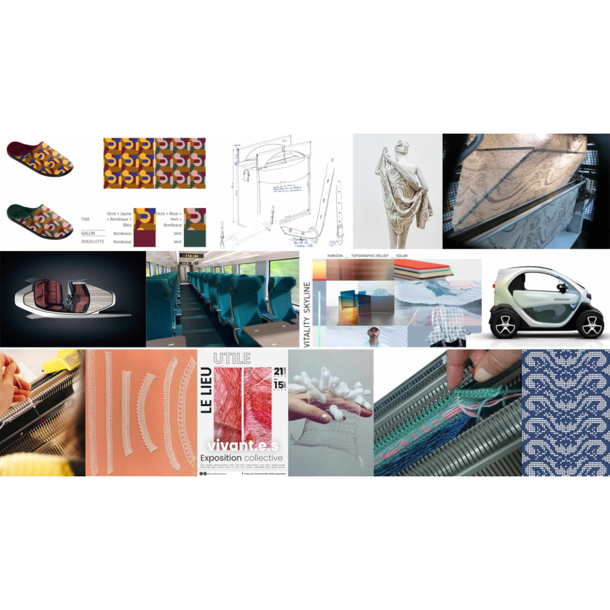 Projets design : chaussons, véhicule léger électrique, parement mural isolant phonique, ...